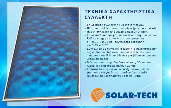 - Επιλεκτική απορροφητική επιφάνεια high selective PVD coating με συντελεστή απορρόφησης α = 0,95 ± 0,02 και συντελεστή εκπομπής ε = 0,05 ± 0,02.